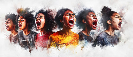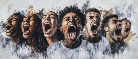A diverse group of young individuals fiercely protests, their voices united in a powerful display. The artwork captures the intensity of their emotions against a gray backdrop.