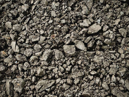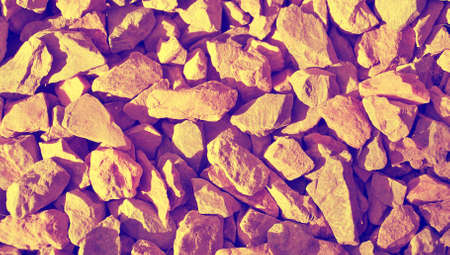 Road gravel and granite gravel texture. Crushed Gravel background. Pile of Stones texture. Industrial coals. Sun beam lights.