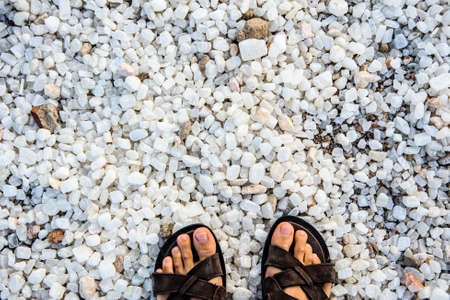Top view on woman's feet in beach shoes with sign Girl Power standing on asphalt.