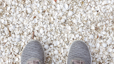 A close-up of the sandy beach with scattered seashells, creating a picturesque shoreline. The intricate patterns of the seashells against the golden sand make it captivating.