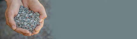 A person holds a handful of gravel, showcasing the texture and size of the construction material. The focus is on the gravel and the hands holding it.