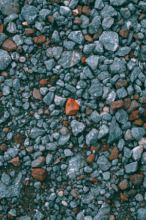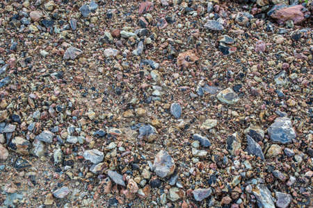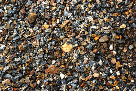 Closeup of small grey beige blue pink red broken crushed stones rocks lying on ground under rain. Natural environmental background texture. Garden rubble macadam top overhead view.