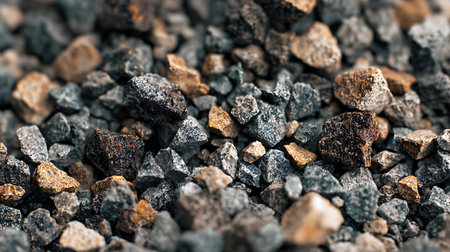 Close-up captures an array of gray and brown rocks and gravel, offering a detailed texture and a spectrum of earthy tones, showing natural geological formations.