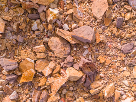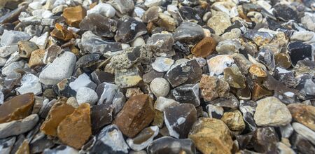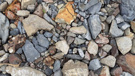 Background with scattered stones of different sizes and colors. Concept for design and background on a geological theme. Top view.