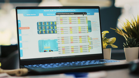 Stock exchange diagrams with charts and stock figures on laptop monitor, close up shot. Hedge fund portfolio listings displayed on notebook screen in financial department