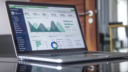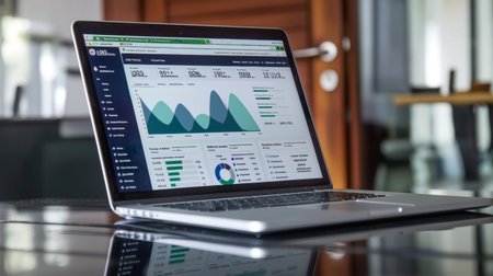A sleek laptop showcases detailed business analytics on its screen, featuring various graphs and charts that visualize data trends in a modern office setting.