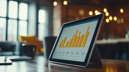 A modern tablet showcases vibrant bar graphs on a wooden table, highlighting data analysis in a stylish workspace with soft lighting for a cozy and inviting atmosphere.