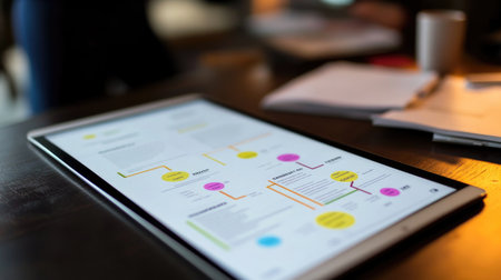 A digital tablet shows an intricate mind map and notes, surrounded by a blurred coffee cup and papers, reflecting productivity and creative brainstorming in a workspace.