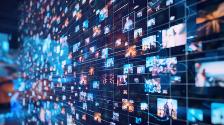 Realistic photography of digital media technology featuring video wall and internet news elements
