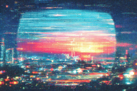 Glitch effect creates vibrant blocks and distorted patterns in urban skyline