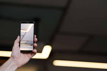 Futuristic track lighting. Closeup of male hand holding smartphone, taking picture of illuminated ceiling. Blur background.