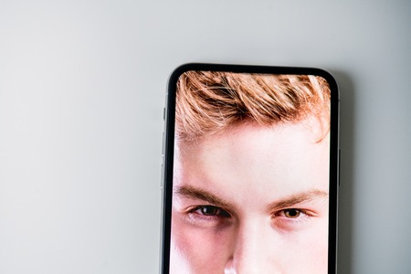 A young guy holds a smartphone of the future in his hands and communicates online.