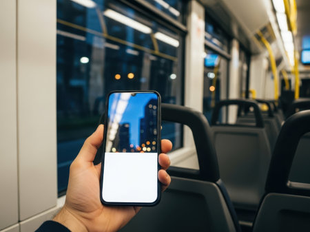 A young woman is riding a bus in the city at night with a smartphone in her hand.