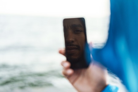 Photo of a strong handsome young african sports man outdoors at the beach sea using mobile phone take selfie talking.
