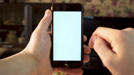 Video and photography on a mobile phone. Smartphone in a man's hand. White screen as a template, mock-up. Blank for embedding any image. Close-up.