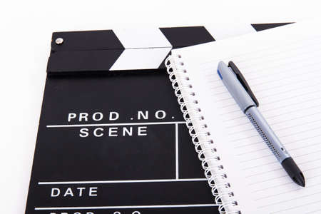 Black cinema clapper board and notebook for scenario with pen, isolated on white background.