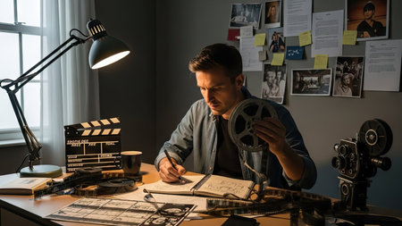 A man is shown writing in a notebook at a desk. The scene is illuminated by a desk lamp. The setting includes movie reels, film equipment, and a clapperboard. The image displays a dimly lit environment with a vintage aesthetic. This could be suitable for editorial or commercial content related to filmmaking.