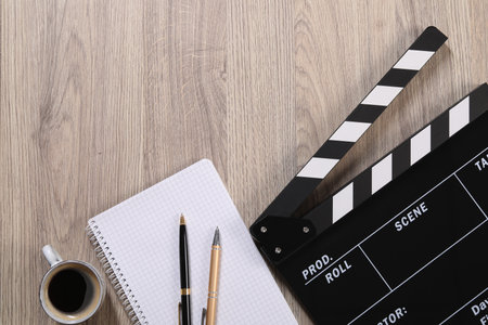 Movie clapper, notebook, coffee and pens on wooden table, flat lay. Space for text
