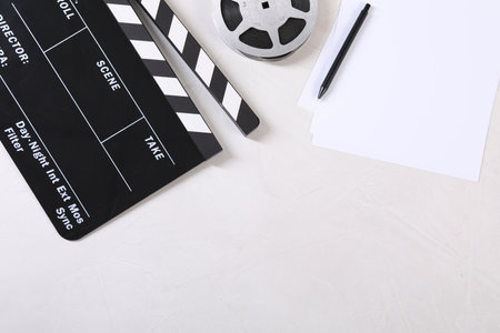 Filmmaking concept. Movie Clapperboard. Cinema begins with movie clappers. Top view. Copy space. Place for your text.