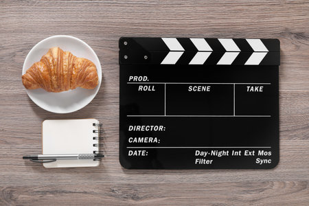 Movie clapper, croissant, notebook and pen on wooden table, flat lay