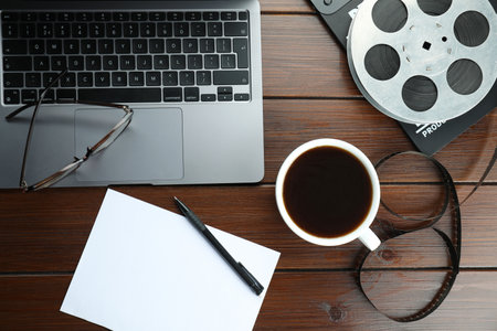 Flat lay composition with film reel and laptop on wooden table