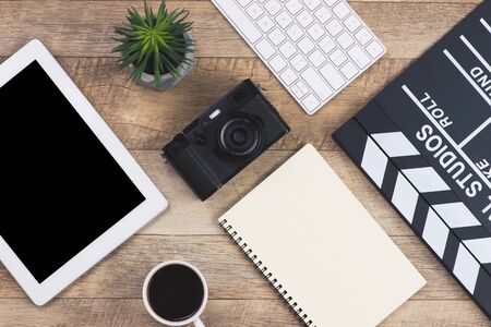 film director's desk on wood background. top view shot