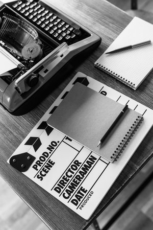 Clapper board and vintage typewriter at wooden desk table. Writer or screenwriter creative concept