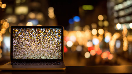 A laptop sits open, displaying vibrant lights that imitate a festive display, while blurred city lights create a soft background glow at night.