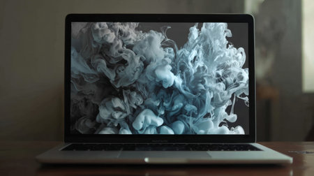 A laptop displays vibrant blue and white smoke textures, creating an artistic digital scene and a tranquil indoor atmosphere.