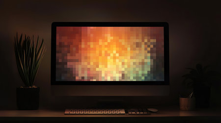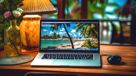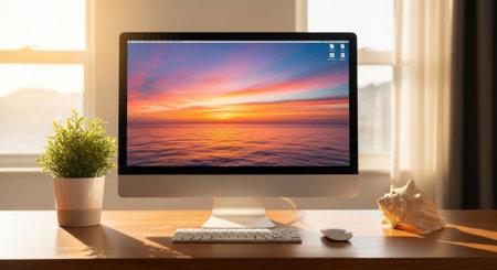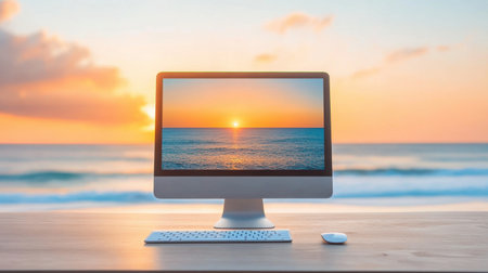 A modern computer displays a stunning ocean sunrise, creating a tranquil workspace. Ideal for digital nomads seeking inspiration and a serene atmosphere.