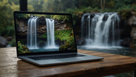 Fantasy background with waterfall coming out from a laptop screen. Synergy of nature and technology. Eco friendly industry concept. Copy space.