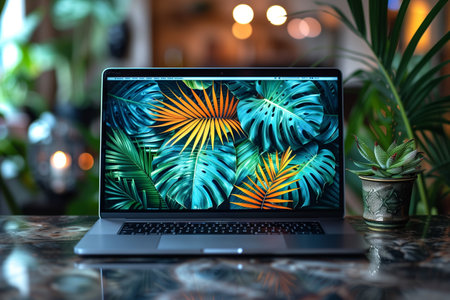 Laptop Screen Displays Tropical Leaves in a Modern Office Space