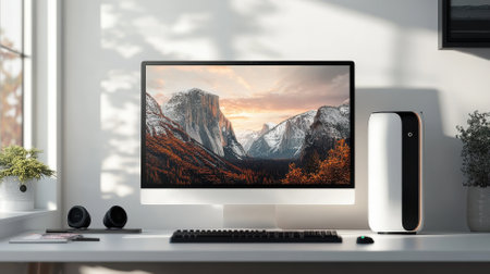 A clean and modern computer setup featuring a desktop monitor displaying a vibrant sunset wallpaper, perfect for a productive and inspiring workspace.