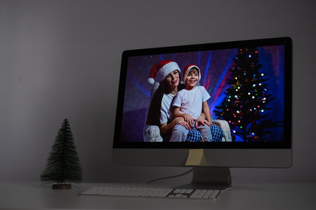 Mother and son in santa claus hats congratulate merry christmas on a video call on a computer