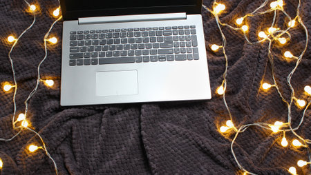 Laptop with blank screen on table in front of blurred Christmas lights.