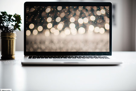 Laptop with abstract colorful bokeh background. Technology and communication concept.