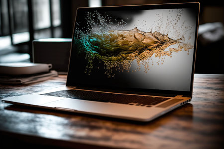 An AI generated illustration of a modern laptop computer is featured, showing the device with liquid splashes on the display