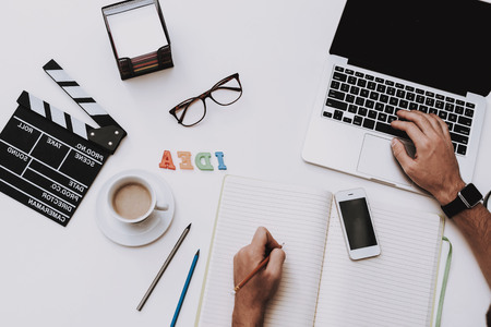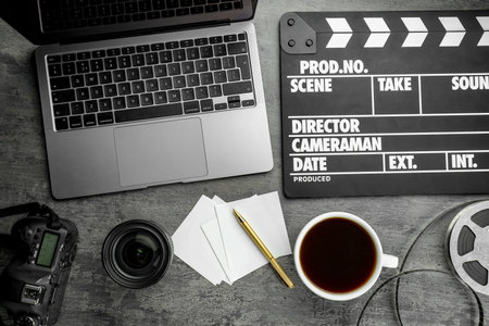 Close up of a vintage clapboard with laptop, 8mm filmstrip, notebook and pencil.