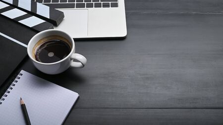 office stuff with Movie clapper, laptop, smartphone, tablet, coffee cup, pen, notepad and documents on the black table top view shot.