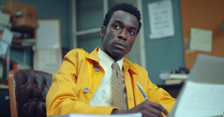 A man is shown writing in a notebook at a desk. The scene is illuminated by a desk lamp. The setting includes movie reels, film equipment, and a clapperboard. The image displays a dimly lit environment with a vintage aesthetic. This could be suitable for editorial or commercial content related to filmmaking.