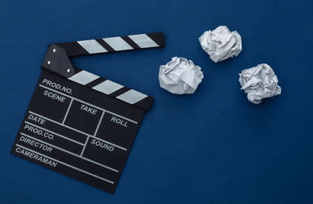 Movie clapper board with crumpled paper balls on classic blue background. Filmmaking, Movie production. Color 2020
