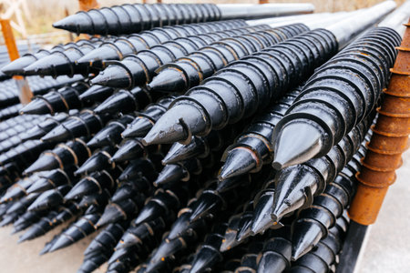 Stack of screw piles for house foundation.