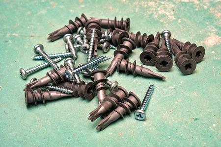 Plastic anchor and bolts on background, construction tool.