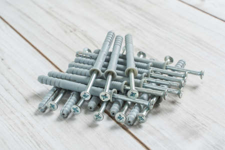 Group of Dowels and Nails on wooden background. Dowels for fastening in concrete. Stock photo.
