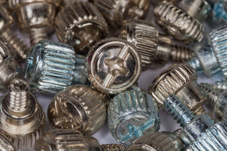 Pile of shoulder thumb screws with combined flat and cross recessed head, white and blue corrosion coating, top view close-up in selective focus