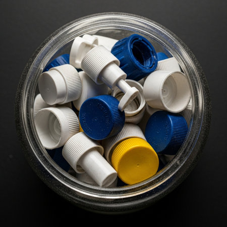 Caps from various bottles gathered in a moody dark bin, symbolizing organized recycling