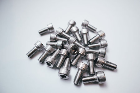 A top-down shot of scattered silver bolts. Professional industrial fasteners and hardware components for mechanical engineering and DIY assembly projects