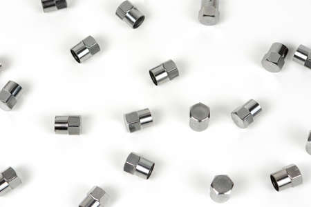 Repair of winter studded tires. Repaired spikes scattered on a white background. Replaced lost tire spikes.