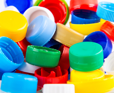 Conception of plastic processing for ecology or charity. Collection of various colorful plastic screw caps. Useful as background