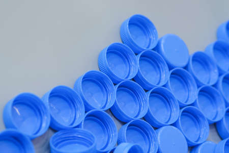 The pile of plastic caps of drinking water bottles. The plastic caps manufacturing concept.